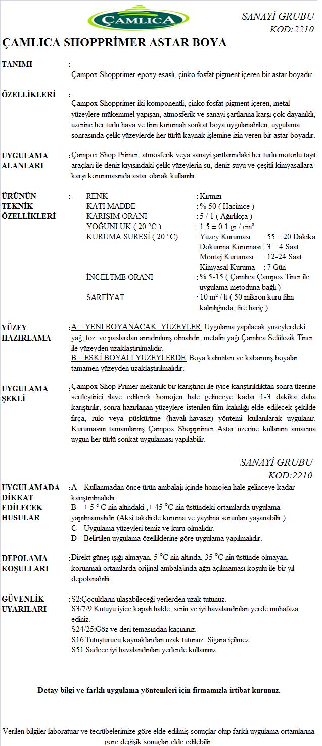 Ürün Adı | : | ÇAMPOX Epoxy Shopprimer Astar Boya |