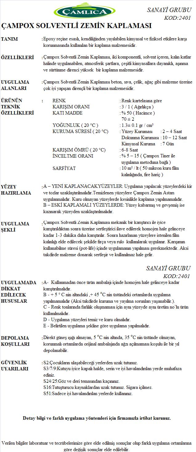Ürün Adı | : | ÇAMPOX Solventli Epoxy Zemin Kaplaması |
